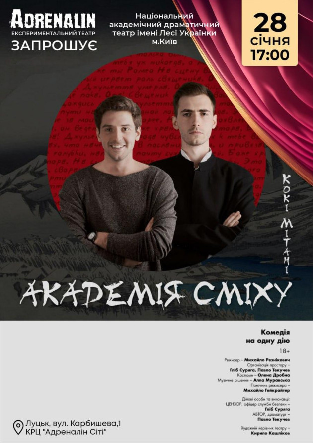 Національний академічний драматичний театр імені Лесі Українки у Луцьку в Експериментальному театрі «Адреналін» із виставою «Академія сміху»!