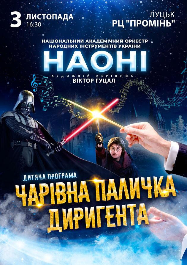 Чи здатна музика змінити сутність людини? Як вона впливає на людину та її вчинки? “Чарівна паличка диригента” відповість на ці та інші питання. НАОНІ Оркестра, диригент, Дарт Вейдер та Гаррі Поттер проведуть вас у казковий світ. В ньому відбуваються дивовижні події. Ви станете свідком надзвичайних речей. Світ Гаррі Поттера та світ “Зоряних війн” постане перед вами в образі відеофрагментів з фільмів та музики.