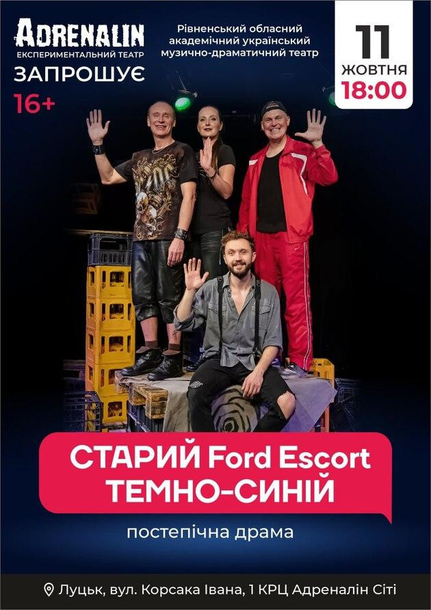 Рівненський обласний академічний музично-драматичний театр у Луцьку в Експериментальному театрі «Адреналін» із виставою «СТАРИЙ Ford Escort ТЕМНО-СИНІЙ»!
